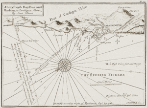 خليج آبريستويث من مسح في سنة 1748 قام به لويس موريس (1701–1765) |