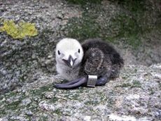 When feeding their young, they generally deliver small loads. Adults will mainly feed only one fish to their chick with high feeding deliveries at dawn and decreased feeding 4 hours before dark.[15] Females will generally feed their chicks more frequently than males.[34] They may well fly more than 100 km (60 mi) out to sea to feed when during egg incubation, but when provisioning the young, they forage closer to the nesting grounds, some 12 km (7+1⁄2 mi) away, and often in shallower water.[21]