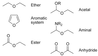 | Tetrahydrofuran (THF) | A cyclic ether, one of the most polar simple ethers that is used as a solvent. | |