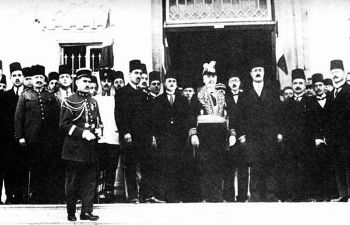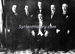 رئيس الدولة أحمد نامي، متوسطًا أعضاء حكومته، سنة 1925. من اليمين: وزير الزراعة نصوح البخاري - وزير العدل يوسف الحكيم - وزير المعارف شاكر الحنبلي - وزير المال حمدي نصر - وزير الداخلية رؤوف الأيوبي.