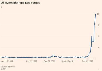 الاحتياط الفدرالي يضخ 75 مليار دولار في النظام المالي بعد ارتفاع حاد لسعر (فائدة) الاقتراض قصير المدى إلى 10%. ويخص الاقتراض النقدي (كاش) بضمان سندات الخزانة الأمريكية لمدة يوم باستخدام اتفاقيات إعادة شراء (Repo). هذا الارتفاع جرّ معدل فائدة الأموال الفدرالية لأعلى لتصل 2.25%، وهو الحد الأقصى للنطاق المستهدف للسندات من 2 إلى 2.25%.