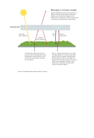 في الخمسينيات من القرن الماضي، كان عالم فيزياء الغلاف الجوي الياباني سيوكورو مانابي ضمن الباحثين الشباب والنابغين في طوكيو الذين غادروا اليابان التي دمرتها الحرب، واستمروا في حياتهم المهنية في الولايات المتحدة. كان الهدف من بحث مانابي، مثل بحث أرهينيوس قبل حوالي سبعين عامًا، هو فهم كيف يمكن أن تؤدي المستويات المتزايدة من ثاني أكسيد الكربون إلى زيادة درجات الحرارة. ومع ذلك، بينما ركز أرهينيوس على توازن الإشعاع، فقد ركز مانابي في الستينيات العمل على تطوير نماذج فيزيائية لدمج النقل الرأسي للكتل الهوائية بسبب الحمل الحراري، بالإضافة للحرارة الكامنة لبخار الماء.