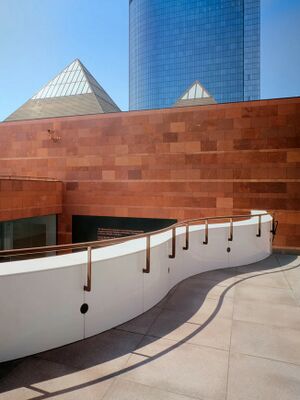 قام إيسوزاكي أخيرًا ببناء المتحف كقرية من المواد الصلبة الأفلاطونية المكسوة بالحجر الرملي الأحمر الهندي الغني، مع مناور هرمية كبيرة تضيء صالات العرض الهادئة أدناه. قدم المعرض الأول - الضخم، المتوهج، الذي لا يزال معلماً بصرياً بارزاً - المفهوم الياباني للما، والذي يوصف أحيانًا بالفراغ المليء بالاحتمالات، إلى مجموعة غربية من الأشكال المستحضرة مباشرة من كتاب الهندسة. قال السيد جيري عند افتتاحه: "كان هذا المعرض يستحق البناء بأكمله".