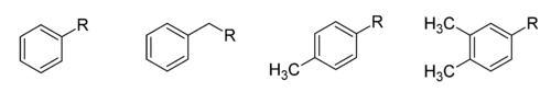 A phenyl group is the simplest aryl group, here bonded to an "R" group.