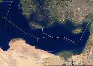 أنبوب الغاز الإسرائيلي المزمع (باللون الأبيض) من لڤياثان إلى أوروپا، بعيدا عن أي مطالب تركية.