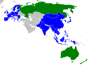 ASEM currently has 45 partners, comprising of 43 countries and 2 international organizations. The partnersare Austria, Belgium, Brunei, Bulgaria, Cambodia, China, Cyprus, Czech Republic, Denmark, Estonia, Finland, France, Germany, Greece, Hungary, India, Indonesia, Ireland, Italy, Japan, Korea, Laos, Latvia, Lithuania, Luxembourg, Malaysia, Malta, Mongolia, Myanmar, the Netherlands, Pakistan, the Philippines, Poland, Portugal, Romania, Singapore, Slovakia, Slovenia, Spain, Sweden, Thailand, United Kingdom, Vietnam, European Commission and ASEAN Secretariat.