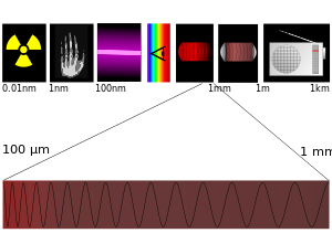 The terahertz band, covering the wavelength range between 0.1 and 1 mm, is identical to the submillimeter wavelength band. However, typically, the term "terahertz" is used more often in marketing in relation to generation and detection with pulsed lasers, as in terahertz time domain spectroscopy, while the term "submillimeter" is used for generation and detection with microwave technology, such as harmonic multiplication.[بحاجة لمصدر]