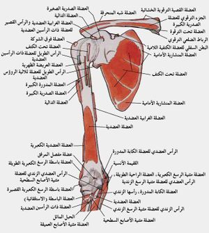 أما عضلات الكتف فهي العضلة الدالية التي تقع فوق مفصل الكتف وتتقلص عند رفع الطرف العلوي وهي مثلثة تشبه حرف دلتا، والعضلة فوق الشوك والعضلة تحت الشوك والعضلة المدورة الكبيرة teres major والعضلة المدورة الصغيرة.