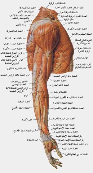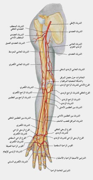 ـ ناحية العضد الأمامية: فيها العضلة الغرابية العضدية وذات الرأسين العضدية biceps brachii والعضدية الأمامية ويمر منها العصب المتوسط والشريان العضدي arteria brachialis والعصب الكعبري. وفي أسفل هذه الناحية الحفرة المرفقية التي ينقسم فيها الشريان العضدي إلى شعبتيه النهائيتين: الكعبري radialis والزندي ulnaris كما يمر فيها العصب المتوسط والعصب الكعبري والعصب الزندي.