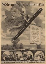 Lewis Waterman, an insurance salesman in New York City, invented the first truly functional fountain pen in the early 1880s. A typical pen of the day leaked all over a contract he had prepared for a large policy, and by the time Waterman returned with a new document, his client had signed with someone else.[2] Later, Waterman was working as a pen salesman in New York for a new company founded in the spring of 1883 by a volatile inventor named Frank Holland. Holland abandoned his company after only six weeks; Waterman stepped in and took over, fitting the pens with a simplified feed of his own design.[3] It was for this "three fissure feed" that his first pen-related patent was granted in 1884.[4]