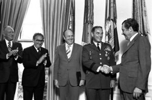 In this position, Haig helped South Vietnamese president Nguyen Van Thieu negotiate the final cease-fire talks in 1972. Haig continued in the role until January 4, 1973,[19] when he became vice chief of staff of the Army. Nixon planned to appoint Haig as chief of staff over Creighton Abrams, whom he personally disliked, but secretary of defense Melvin Laird resisted as Haig lacked the relevant upper-level command experience.[20] He was confirmed by the U.S. Senate in October 1972, thus skipping the rank of lieutenant general. By appointing him to this billet, Nixon "passed over 240 generals" who were senior to Haig.[21]