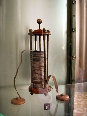 وقد لاحظ فولتا أن قدم الضفدعة يعتبر موصل للكهرباء وفي نفس الوقت مجس لها. أعاد فولتا نفس التجربة التي قام بها گالڤاني ولكنه إستبدل قدم الضفدعة بورق مملح إذ أنه يعتبر مجس للكهرباء حسب تجارب سابقة له.