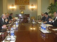 وزير الخارجية المصرية نبيل فهمي في اجتماع مع أهارون سالزبرگ، والمبعوث الخاص للاتحاد الأوروپي في القرن الأفريقي، مايو 2014.[1]