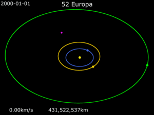 Europa is a very dark carbonaceous C-type, and is the second largest of this group. Spectroscopic studies have found evidence of olivines and pyroxenes on the surface,[9] and there is some indication that there may be compositional differences between different regions[10] It orbits close to the Hygiea asteroid family, but is not a member.