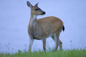 The Sitka deer or Sitka black-tailed deer (Odocoileus hemionus sitkensis) is a subspecies of mule deer (Odocoileus hemionus), similar to the Columbian black-tailed subspecies (O. h. colombianus). Their name originates from Sitka, Alaska, and it is not to be confused with the similarly named sika deer. Weighing in on average between 48 و 90 kg (106 و 198 lb), Sitka deer are characteristically smaller than other subspecies of mule deer. Reddish-brown in the summer, their coats darken to a gray-brown in mid- to late August. They are also good swimmers, and can occasionally be seen crossing deep channels between islands. Their average lifespan is about 10 years, but a few are known to have attained an age of 15.[1]