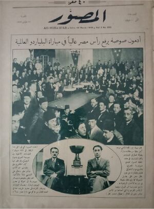 كان مساء يوم الجمعة موعد اخر حفلة من حفلات مباراة بطولة العالم فى البلياردو وكان المتباريان فى هذة الحفلة "ادمون افندى صوصة المصرى"و"والمسيو مونز البلجيكى"فاسفرت المباراة عن فوز بطل مصر على بطل البلجيك كما ترى ذلك مفصلا فى باب"الالعاب المصرية",وترى صورتهما الى اليسار وبينهما الكاس الفرعونية التى اهداها "سمو الامير عباس حليم"الى الفائز اخذت الصورة التى فى اعلى الكلام فى اثناء مباراة البلياردو الاخيرة بين صوصة المصرى ومونز البلجيكى وقد ظهر فيها كبار الحاضرين وفى مقدمتهم سمو الامير عباس حليم ومعالى على الشمسى باشا والدكتور احمد ماهر وغيرهم ,وسيسافر صوصة الى امريكا فى هذين اليومين لينازل ابطال البلياردو وسيطلع القراء على حديث طريف معة فى العدد القادم من "كل شىء"