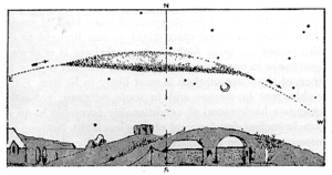 ظاهرة غريبة في 17 نوفمبر 1882، رصدها ووصفها ماوندر في The Observatory، يونيو 1883 (pp. 192–193) and April 1916 (pp. 213–215)، والتي سماها "auroral beam" و "زائر سماوي غريب." الرسم من الفلكي وخبير aurora جون راند كاپرون، مرصد گيلداون، سري، المملكة المتحدة، الذي رصدها أيضاً. من المجلة الفلسفية، مايو 1883.