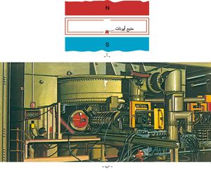 الشكل (2) مشهد عام لأجزاء السيكلوترون (أ) نصفا العلبة بين قطبي مغنطيسي قوي وضمن علبة مفرغة (ب) مشهد عام للسيكلوترون