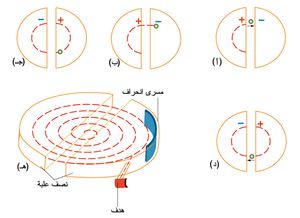 الشكل (1) مبدأ عمل السيكلوترون (أ) الجسيم يتسارع في الفجوة بين نصفي العلبة (ب) الجسيم في معزل عن تغيرات الحقل الكهربائي (جـ) انعكاس الفولطية بين نصفي العلبة (د) الجسيم يتسارع نحو نصف العلبة الآخر (هـ) توضع مسرى الانحراف في إحدى النصفين