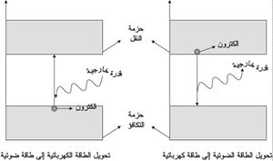 أمّا في الحالة الثانية التي يقفز فيها الإلكترون من مدار أبعد عن النواة إلى مدار أقرب إليها، أو ينتقل من حزمة النقل إلى حزمة التكافؤ فسوف يتم إشعاع طاقة ضوئية (فوتونات) تساوي الفرق بين مستوى الطاقة التي قفز منها الإلكترون والمستوى الذي هبط إليه، ومن ثم تم تحويل الطاقة الكهربائية إلى طاقة ضوئية. ويبين الشكل (2) هاتين الظاهرتين.