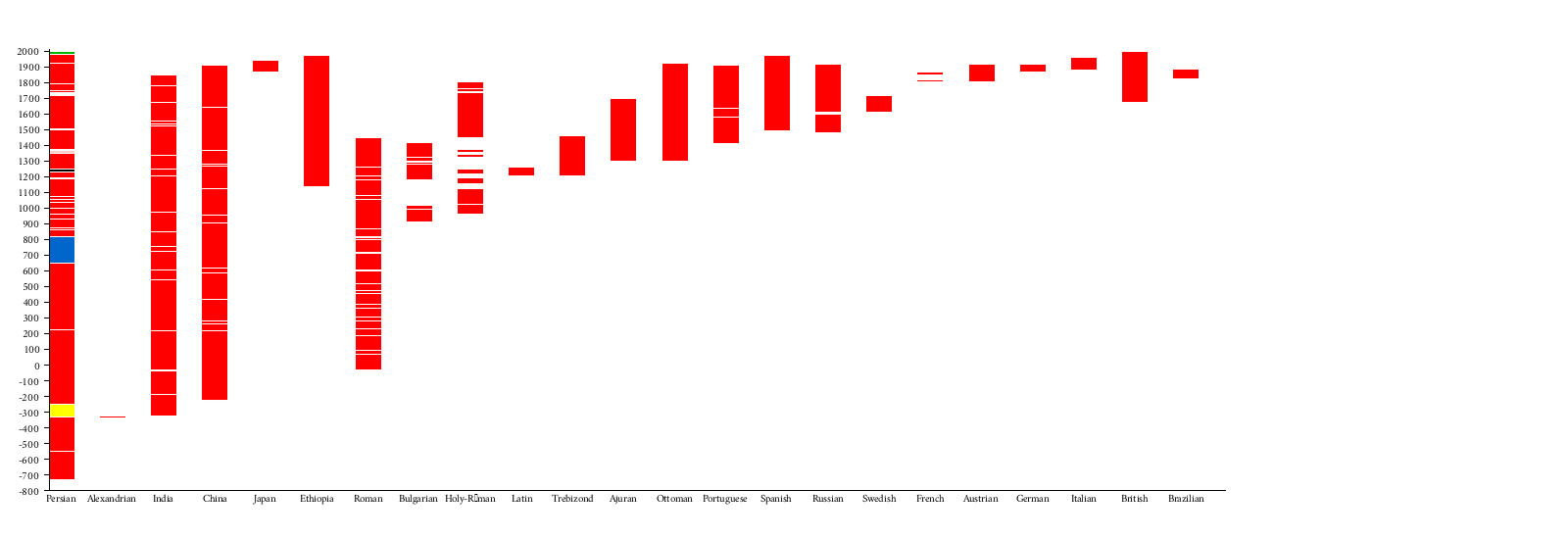 The chart below shows a timeline of polities that have been called empires. Dynastic changes are marked with a white line.[20]