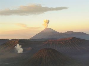 حقول الأرز توفر الغذاء الرئيسي للإندونيسيين. يقع هذا الحقل وسط جاوة قرب جبل النار، البركان الذي ثار عام 1954م.