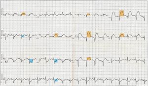 12-lead electrocardiogram showing ST-segment elevation (orange) in I, aVL and V1-V5 with reciprocal changes (blue) in the inferior leads, indicative of an anterior wall myocardial infarction.