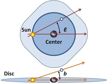 ويبدأ خط الطول المجري من مركزها = 17ساعة 42.4 دقيقة و = -28.92° ويكون مستوي المجرة مائلا نحو 62,6° من خط الاستواء المجري.