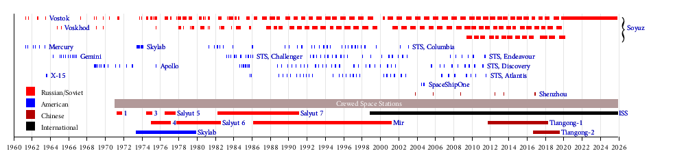 كان يوري هو أول إنسان يرتاد الفضاء، حيث حلق على متن مركبة الفضاء ڤوستوك 1، التي أطلقها الاتحاد السوڤيتي في في 12 أبريل 1961 كجزء من برنامج ڤوستوك. حلق البشر على سطح القمر تسع مرات من عام 1968 حتى 1972 ضمن برنامج أپولو الأمريكي، واستمر 19 عاماً و130 يوماً على محطة الفضاء الدولية.[1] جميع رحلات الفضاء البشرية كانت تحت قيادة بشرية، حيث تم البدء في تصميم أول مركبة فضائية ذاتية تحمل البشر في عام 2015.