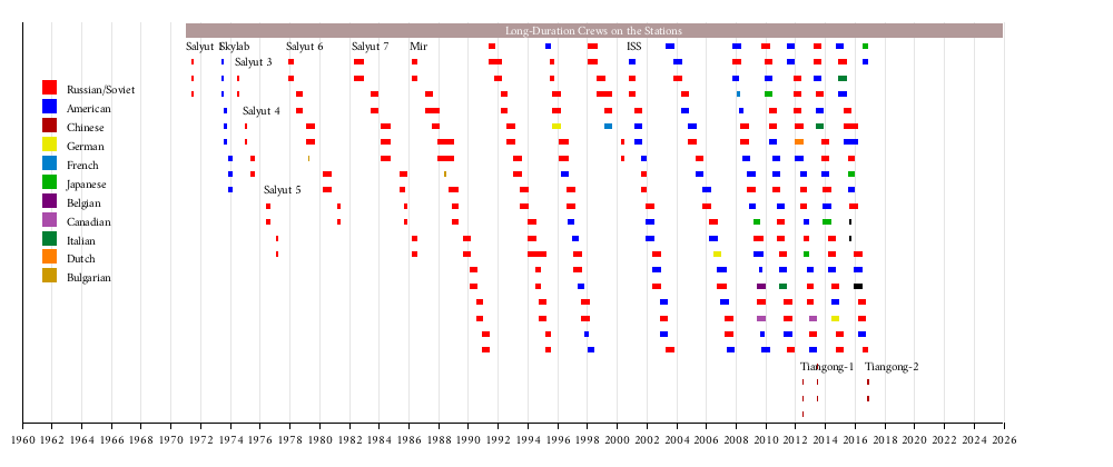 Chen Dong (astronaut)Jing HaipengWang YapingZhang XiaoguanNie HaishengLiu YangLiu WangJing HaipengKathleen RubinsTakuya OnishiAnatoli IvanishinJeffrey WilliamsOleg SkripochkaAleksey OvchininTimothy PeakeTimothy KopraYuri MalenchenkoAidyn AimbetovAndreas MogensenSergey VolkovKjell N. LindgrenKimiya YuiOleg KononenkoScott KellyMikhail KorniyenkoGennady PadalkaTerry W. VirtsSamantha CristoforettiAnton ShkaplerovBarry E. WilmoreYelena SerovaAleksandr SamokutyayevAlexander GerstGregory R. WisemanMaksim SurayevSteven R. SwansonOleg ArtemyevAleksandr SkvortsovKoichi WakataRichard A. MastracchioMikhail TyurinMichael S. HopkinsSergey RyazanskyOleg KotovLuca ParmitanoKaren L. NybergFyodor YurchikhinChristopher J. CassidyAleksandr MisurkinPavel VinogradovThomas H. MarshburRoman RomanenkoChris HadfieldEvgeny TarelkinOleg NovitskiyKevin A. FordAkihiko HoshideYuri MalenchenkoSunita L. WilliamsSergei RevinGennady PadalkaJoseph M. AcabaDonald PettitAndré KuipersOleg KononenkoDaniel C. BurbankAnatoli IvanishinAnton ShkaplerovSatoshi FurukawaMichael E. FossumSergey Alexandrovich VolkovRonald J. GaranAleksandr SamokutyayevAndrei BorisenkoPaolo NespoliCatherine G. ColemanDimitri KondratyevOleg SkripochkaAleksandr KaleriScott Kelly (astronaut)Fyodor YurchikhinShannon WalkerDouglas H. WheelockTracy Caldwell DysonMikhail KorniyenkoAleksandr Skvortsov (cosmonaut)Soichi NoguchiTimothy CreamerOleg KotovMaksim SurayevJeffrey WilliamsNicole StottRobert ThirskRoman RomanenkoFrank De WinneTimothy KopraMichael R. BarrattGennady PadalkaKoichi WakataSandra MagnusYuri LonchakovMichael FinckeGregory ChamitoffOleg KononenkoSergey VolkovGarrett ReismanLéopold EyhartsDaniel TaniYuri MalenchenkoPeggy WhitsonClayton AndersonOleg KotovFyodor YurchikhinSunita WilliamsMikhail TyurinMichael Lopez-AlegriaThomas ReiterJeffrey WilliamsPavel VinogradovValery TokarevWilliam McArthurJohn PhilipsSergei KrikalevSalizhan SharipovLeroy ChiaoMichael FinckeGennady PadalkaAlexander KaleriMichael FoaleEdward LuYuri MalenchenkoDonald PettitNikolai BudarinKenneth BowersoxSergei TreshchevPeggy WhitsonValery KorzunCarl WalzDaniel BurschYury OnufrienkoVladimir DezhurovMikhail TyurinFrank CulbertsonJames VossSusan HelmsYuri UsachevYuri GidzenkoSergei KrikalevWilliam ShepherdAleksandr KaleriSergei ZalyotinJean-Pierre HaigneréViktor AfanasyevSergei AvdeyevGennady PadalkaNikolai BudarinTalgat MusabayevAndrew ThomasDavid WolfPavel VinogradovAnatoly SolovyevMichael FoaleAleksandr LazutkinVasili TsibliyevJerry LinengerJohn BlahaAleksandr KaleriValery KorzunShannon LucidYury UsachevYuri OnufrienkoThomas ReiterSergei AvdeyevYuri GidzenkoNikolai BudarinAnatoly SolovyevNorman ThagardGennady StrekalovVladimir DezhurovYelena KondakovaAleksandr ViktorenkoTalgat MusabayevYuri MalenchenkoValeri PolyakovYury UsachevViktor AfanasyevAleksandr SerebrovVasili TsibliyevAleksandr PoleshchukGennadi ManakovSergei AvdeyevAnatoly SolovyevAleksandr KaleriAleksandr ViktorenkoAleksandr VolkovSergei KrikalevAnatoly ArtsebarskyMusa ManarovViktor AfanasyevGennady StrekalovGennadi ManakovAleksandr BalandinAnatoly SolovyevAleksandr SerebrovAleksandr ViktorenkoSergei KrikalevAleksandr VolkovValeri PolyakovAleksandr Panayotov AleksandrovMusa ManarovVladimir TitovAleksandr AleksandrovYuri RomanenkoAleksandr LaveykinVladimir SolovyovLeonid KizimVladimir SolovyovLeonid KizimAlexander VolkovVladimir VasyutinVladimir DzhanibekovViktor SavinykhOleg AtkovVladimir SolovyovLeonid KizimAleksandr Pavlovich AleksandrovVladimir LyakhovValentin LebedevAnatoli BerezovoyViktor SavinykhVladimir KovalyonokValery RyuminLeonid PopovGeorgi Ivanov (cosmonaut)Valery RyuminVladimir LyankhovAleksandr IvanchenkovVladimir KovalyonokGerogi GrenchoYuri RomanenkoYuri GlazkovViktor GorbatkoVitali ZholobovBoris VolynovVitali SevastyanovPyotr KlimukAleksei GubarevGeorgi GrechkoPavel PopovichYuri ArtyukhinEdward GibsonWilliam PogueGerald CarrOwen GarriotJack LousmaAlan BeanJoeseph KerwinPaul WeitzPete ConradVladislav VolkovViktor PatsayevGeorgi Dobrovolski