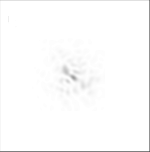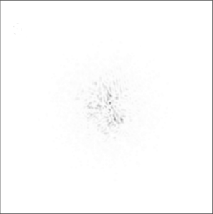 Simulated negative image showing what a single (point-like) star would look like through a ground-based telescope with a diameter of 2r0. Diffraction makes the image appear blurred. The atmosphere would make the blob move around very rapidly, so that in a long-exposure photograph it would appear more blurred.