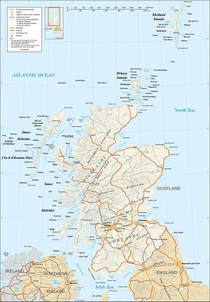 اسكتلندا Scotland ( []ˈskɒt.lənd[]; بالاسكتلندية: [ˈskɔt.lənd]; غالية اسكتلندية: Alba [] ( استمع))، هي بلد يغطي الثلث الشمالي من جزيرة بريطانيا العظمى وجزء من المملكة المتحدة.[12][13][14] تشارك حدودها مع إنگلترة من الجنوب، ويحدها المحيط الأطلسي، وبحر الشمال من الشرق والقنال الشمالي، والبحر الأيرلندي من الجنوب الغربي. بالإضافة للبر الرئيسي، تتكون البلاد من أكثر من 790 جزيرة،[15] من ضمنها الجزر الشمالية وهبرايدز.