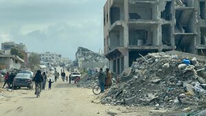 فلسطينيون وسط الأطلال في غزة، فبراير 2025.