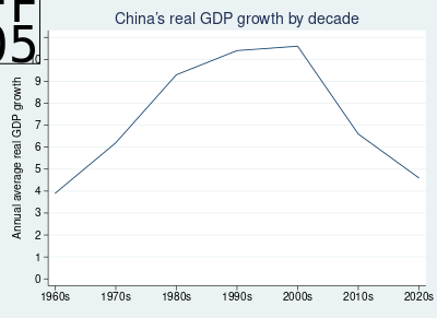 نمو الناتج المحلي الإجمالي الحقيقي في الصين حسب العقد منذ الستينيات، بمعدل تقديري لعقد 2020 من بلومبرگ ترمينال (WRGDCHIN).