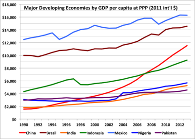 بحسب صندوق النقد الدولي، على أساس دخل الفرد، صنفت الصين في الترتيب 59 حسب الناتج المحلي الإجمالي (الاسمي) ورقم 73 حسب الناتج المحلي الإجمالي (تعادل القوة الشرائية) عام 2020.[96][97] احتلت الصين المرتبة الثالثة حسب الناتج المحلي الإجمالي للفرد (الاسمي) والخامسة حسب الناتج المحلي الإجمالي للفرد (تعادل القوة الشرائية) من بين البلدان التي يزيد عدد سكانها عن 100 مليون نسمة.
