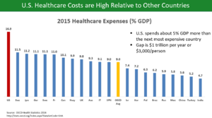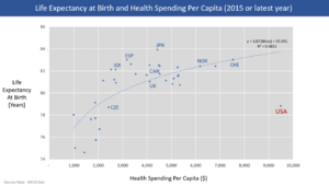 - ^ Link between health spending and life expectancy: US is an outlier. May 26, 2017. By Max Roser at Our World in Data. Click the sources tab under the chart for info on the countries, healthcare expenditures, and data sources. See the later version of the chart here.