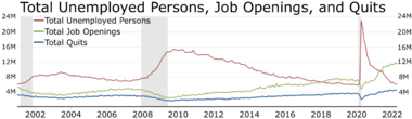 عام 2011، شهد اقتصاد الولايات المتحدة ركودًا مع انتعاش بطيء غير عادي في الوظائف، وعدم عودة عدد الوظائف إلى مستوى فبراير 2001 حتى يناير 2005.[95] تداخل "الانتعاش بلا عودة الوظائف" هذا مع تشكل فقاعة الإسكان ويمكن القول إنها فقاعة ديون أوسع، حيث ارتفعت نسبة ديون الأسرة إلى الناتج المحلي الإجمالي من مستوى قياسي بلغ 70% في الربع الأول من عام 2001 إلى 99% في الربع الأول من عام 2008. كان أصحاب المنازل يقترضون مقابل منازلهم ذات الأسعار الفقاعية لتغذية الاستهلاك، مما أدى إلى ارتفاع مستويات ديونهم مع توفير دفعة غير مستدامة للناتج المحلي الإجمالي. عندما بدأت أسعار المساكن في الانخفاض عام 2006، انخفضت قيمة الأوراق المالية المدعومة بالرهون العقارية بشكل كبير، مما تسبب في ما يعادل تشغيل بنك في نظام مصرفي غير متضمن الإيداع والغير منظم بشكل أساسي، والذي تجاوز نظام الإيداع المصرفي التقليدي المنظم. واجهت العديد من شركات الرهن العقاري وغيرها من البنوك غير المودعة (مثل البنوك الاستثمارية) أزمة تزداد سوءًا في 2007-2008، حيث بلغت الأزمة المصرفية ذروتها في سبتمبر 2008، مع إفلاس ليمان براذرز وإنقاذ العديد من المؤسسات المالية الأخرى.[96]