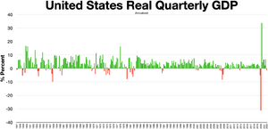 U.S. nominal GDP was $19.5 trillion in 2017. Annualized, nominal GDP reached $20.1 trillion in Q1 2018, the first time it exceeded $20 trillion. About 70% of U.S. GDP is personal consumption, with business investment 18%, government 17% (federal, state and local but excluding transfer payments such as Social Security, which is in consumption) and net exports a negative 3% due to the U.S. trade deficit.[119] Real gross domestic product, a measure of both production and income, grew by 2.3% in 2017, vs. 1.5% in 2016 and 2.9% in 2015. Real GDP grew at a quarterly annualized rate of 2.2% in Q1 2018, 4.2% in Q2 2018, 3.4% in Q3 2018 and 2.2% in Q4 2018; the Q2 rate was the best growth rate since Q3 2014, and the overall yearly GDP growth of 2.9% in 2018 was the best performance of the economy in a decade.[120] In 2020, the growth rate of the GDP has started to drop as a result of the COVID-19 pandemic, resulting in the GDP shrinking at a quarterized annual growth rate of −5.0% in Q1 2020[بحاجة لمصدر] and −32.9% in Q2 2020,[بحاجة لمصدر] respectively.