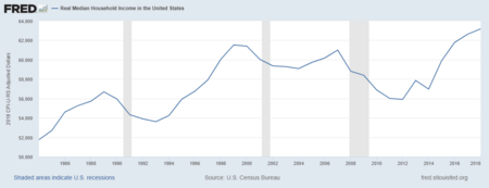 نما الاقتصاد الأمريكي بنسبة المتوسط بنسبة 3.8% من عام 1946 حتى 1973، بينما ارتفع معدل متوسط دخل الأسرة بنسبة 74% (أو 2.1% سنويًا).[90][91]