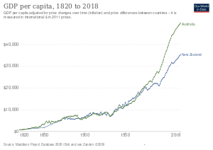 The economy of New Zealand is a highly developed free-market economy.[21] It is the 52nd-largest national economy in the world when measured by nominal gross domestic product (GDP) and the 62nd-largest in the world when measured by purchasing power parity (PPP). New Zealand has one of the most globalised economies and depends greatly on international trade, mainly with China, Australia, the European Union, the United States, and Japan. New Zealand's 1983 Closer Economic Relations agreement with Australia means that the economy aligns closely with that of Australia. Among OECD nations, New Zealand has a highly efficient and strong social security system; social expenditure stood at roughly 21.5% of GDP.[22][23][24]