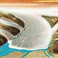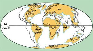 بل 120 مليون سنة (العصر الطباشيري). افترض العلماء أن القارات تشكلت بانفصال الكتلتين العظميين لوراسيا إلى الشمال وجوندوانا إلى الجنوب. توضح الخريطة هاتين الكتلتين اليابستين كما كانت قبل 120 مليون سنة.