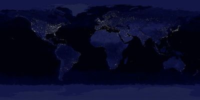 The Earth at night, a composite of DMSP/OLS ground illumination data on a simulated night-time image of the world. This image is not photographic and many features are brighter than they would appear to a direct observer.