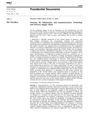 الأمر التنفيذي رقم 13873 وهو بعنوان تأمين سلسلة التوريد والخدمات في مجال تكنولوجيا المعلومات والاتصالات هو أمر تنفيذي وقعه الرئيس الأمريكي دونالد ترمپ في واشنطن العاصمة، يوم الأربعاء 15 مايو 2019،[1] يمنع من خلاله الشركات الأمريكية من استخدام معدات الاتصالات من مصادر تعتبرها الإدارة تهديدات للأمن القومي.[2] هدد الأمر بتصعيد التوترات مع الصين[3] مع تصادم الدولتين حول التجارة وما إذا كانت هواوِيْ - أكبر مزود لأجهزة الاتصالات في العالم - تشكل خطرًا (التجسس) على شبكات البنية التحتية الغربية.[4] رفض مسؤولو البيت الأبيض تحديد الصين وهواوِيْ كهدف مقصود للأمر التنفيذي.[5][6] إلا أنه وبعد إصدار الطلب بفترة وجيزة، أضافت وزارة التجارة الأمريكية هواوِيْ رسميًا إلى قائمة الشركات التي تعتبرها الحكومة الأمريكية "جهات تقوض المصالح الأمريكية"[7]. من خلال إضافة هواوِيْ إلى ما يسمى «قائمة الكيانات»، ضمنت إدارة ترمپ أن يتم تغطية هواوِيْ بموجب الأمر التنفيذي الجديد.[8]