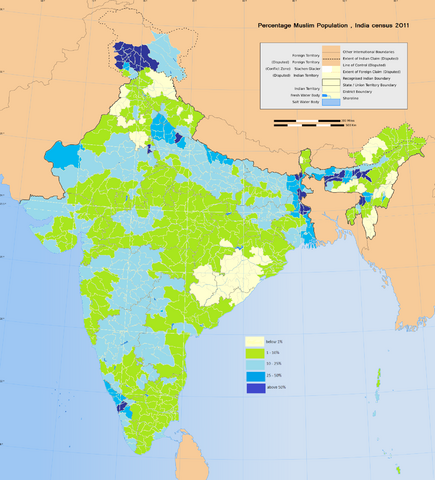 | بيانات من تعداد 2011: مقارنة بين أعداد المسلمين والهندوس.[71] | ||