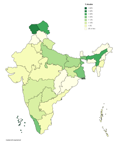 اعتباراً من عاما 2015، كان المسلمون يشكلون غالبية السكان في ولاية هندية واحدة، جمو وكشمير وفي إقليم لاكشادويپ الاتحادي.[60] في 110 ضلع تتركز فيها الأقليات، ما لا يقل عن خمس السكان مسلمون.[61]