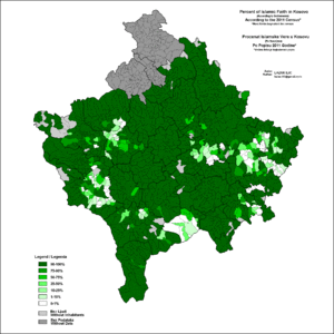 الإسلام في كوسوفو : يعتبر الإسلام في كوسوفو أغلبية حيث يشكل نسبة كبيرة تصل إلى 95%. ويعود تاريخ الإسلام في كوسوفو إلى الفتح العثماني في البلقان. وصل الإسلام إلى كوسوفو بعد معركة كوسوفو في عام 1389 بعد حكم الدولة العثمانية من 1389 حتى 1912. واليوم أكثر من 90٪ من سكان كوسوفو من المسلمين، معظمهم من أصل ألباني.