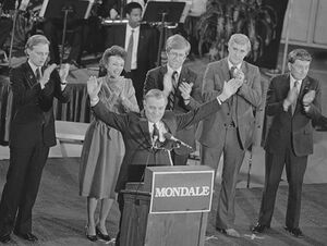 Mondale gradually pulled away from Hart in the delegate count, but, as Time reported in late May, "Mondale ... has a wide lead in total delegates (1,564 to 941) ... because of his victories in the big industrial states, his support from the Democratic Establishment and the arcane provisions of delegate-selection rules that his vanguard helped draft two years ago."[29] After the final primary in California, on June 5, which Hart won, Mondale was about 40 delegates short of the total he needed for the nomination.[30] However, at the Democratic National Convention in San Francisco on July 16, Mondale received the overwhelming support of the unelected superdelegates from the party establishment to win the nomination.