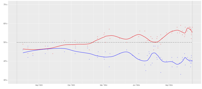 - ^ "Poll Shows Reagan Now Leads Mondale By 16 Points, 56-40". The Washington Post. September 12, 1984 – via Newspapers.com.
