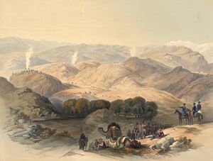 On leaving the city, Elphinstone discovered that the escort promised by Akbar Khan had not materialised, nor had the food and fuel to help with the crossing of the Hindu Kush in winter.[23] Major Eldred Pottinger pleaded with the sick British commander to turn back to Kabul as they still had time to take refuge in the fortress of Bala Hissar. But Elphinstone said there would be no turning back and they would proceed to Jalalabad.[24] The column of 16,000 soldiers and civilians was now at the mercy of the Afghan tribes.