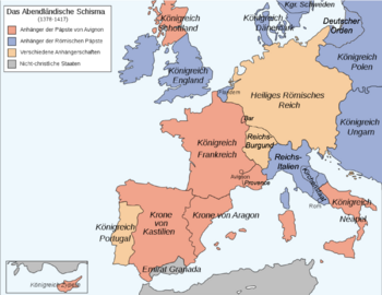 | فرنسا، أراگون، قشتالة وليون، قبرص، برگندي، ساڤوا، ناپولي، واسكتلندة اعترفوا بمدعي أڤنيون; | الدنمارك، إنگلترة، الفلاندرز، الامبراطورية الرومانية المقدسة، المجر، شمال إيطاليا، أيرلندا، النرويج، پولندا، والسويد اعترفوا بالمدعي الروماني. |